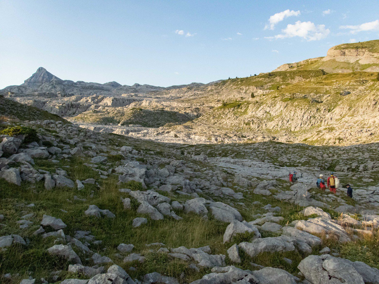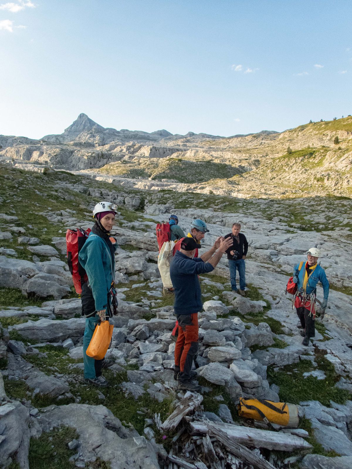 Le mollet de Papou est toujours aussi douloureux, il souhaite repartir rapidement car il craint de laisser la blessure « refroidir ». De mon côté je sens pointer des maux de ventre, je dégaine le spasfon que j’ai toujours à portée de main. Guillaume donne un doliprane codéiné à Papou en espérant que cela le soulage un peu. Au moment de repartir on constate que les sacs sont vraiment alourdis par les néo mouillés. On décide donc de se délester un peu et on laissera un sac à gravats en évidence afin qu’une prochaine équipe le prenne en passant.